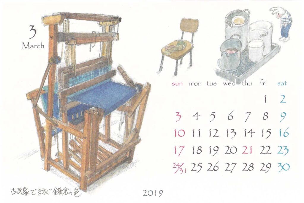 画家・伊東雅江さんの「鎌倉カレンダー」2019年3月より。「古民家で紡ぐ鎌倉の色」という催し物の案内を図書館で見つけました。鎌倉の野山・道端などに生えている植物で糸を染めてその糸を紡ぎ布を織る、染織家たなか牧子さんからお話を聞くセミナーでし...